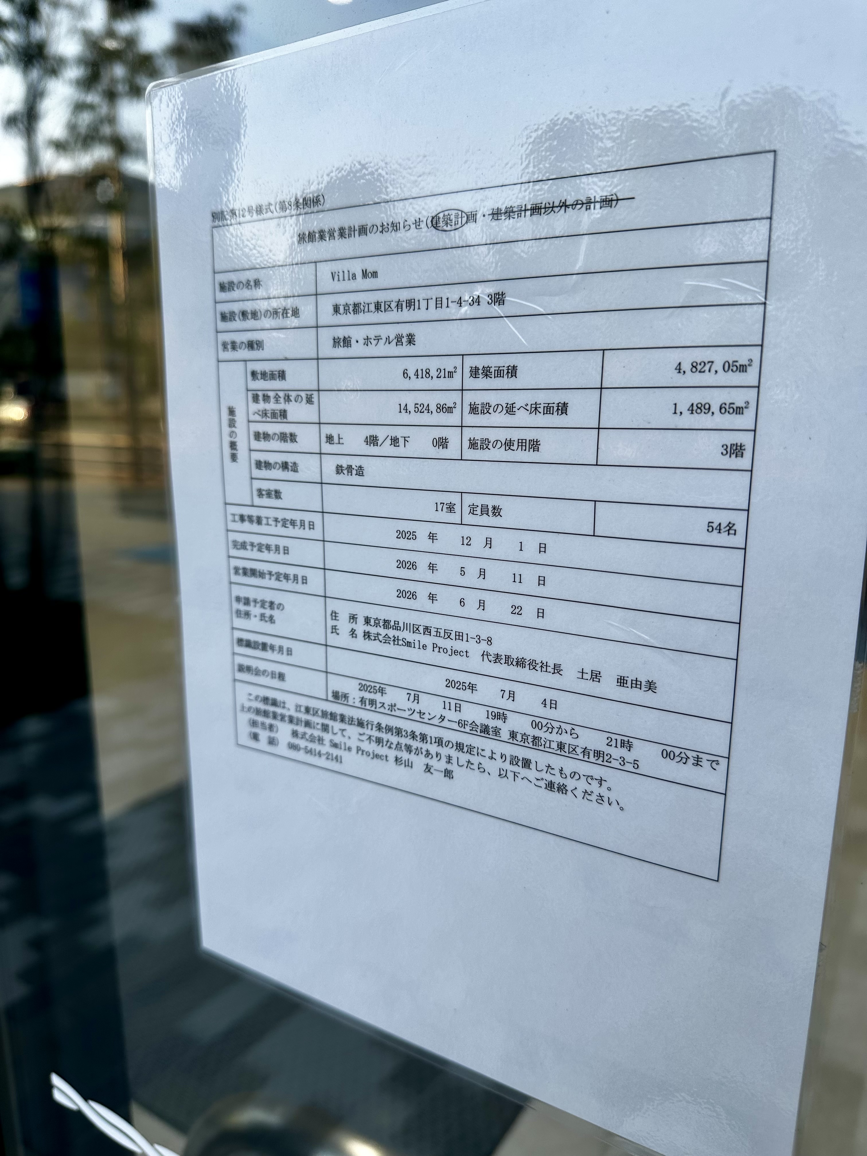 3階には旅館・ホテル営業の許可申請中の産後ケアホテル「Villa Mom」が入居予定です。建物内に掲示された届出書類によると、客室17室・定員54名の施設で、2026年6月22日の営業開始を予定。運営は株式会社Smile Project(品川区西五反田)が手がけます。